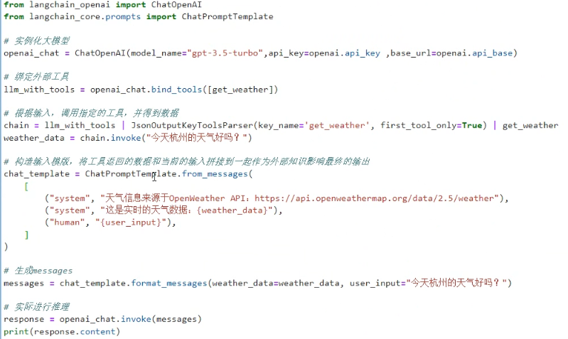 # 将函数注册为“工具” , 可以注册多个 llm_with_tools = llm.bind_tools([get_weather, get_air_quality, recommend_travel])
